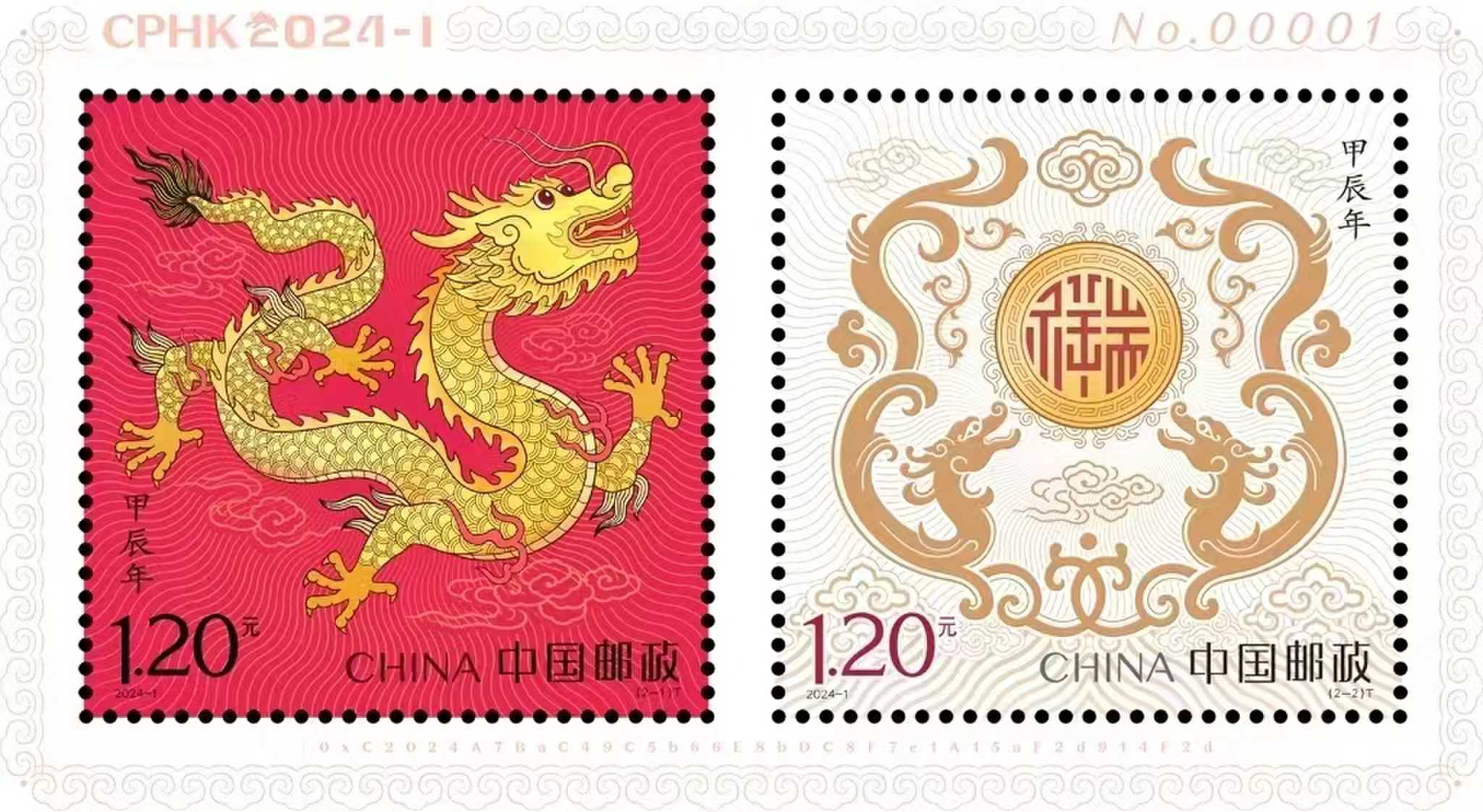 2024年是農曆甲辰年,即中國傳統生肖紀年的龍年。龍是中華民族的圖鑒和獨特精神標識,寄托著人們的理想和願望,是威嚴、力量、進取與祥瑞的象徵。《甲辰年》特種郵票一套兩枚:第一枚名爲“天龍行健”,五爪金龍形象源出九龍壁上的造型;第二枚名爲“辰龍獻瑞”,取材于傳統吉祥紋樣“祥龍拱壁”。兩枚郵票主打紅、金、黑三色,郵票中的金龍,靈動婉轉而不失莊重敦厚,祥瑞福臻而不失朝氣蓬勃,高度契合了喜慶祥和、迎吉納福的審美取向。Want to say hey?© LaunchMyNFT 2024